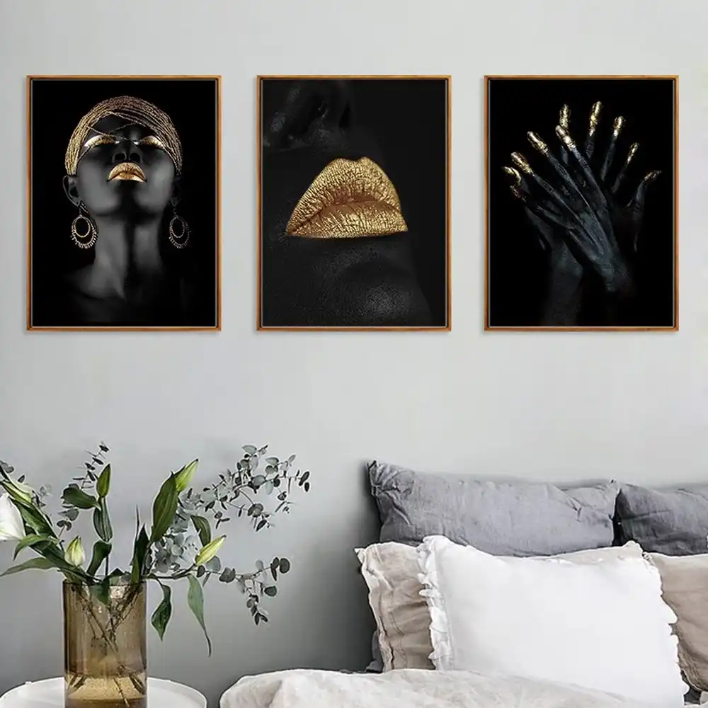 Pintura artística para mujeres africanas, labios dorados sexys, Cuadros decorativos, cuadros colgantes para sala de estar, pasillo, pinturas de Lienzo sin marco|Pintura y caligrafía| - AliExpress